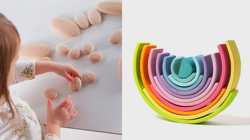 Piedras de madera :Estas 20 piedras de madera con forma orgánica están inspiradas de la naturaleza para liberar el potencial de creatividad instintivo de cada usuario. Se han limado de manera extremadamente lisa para realzar el grano y los tonos naturales de la madera. Los diferentes tamaños permiten a los niños entender el concepto de peso y gravedad y trabajar la noción de clasificación.