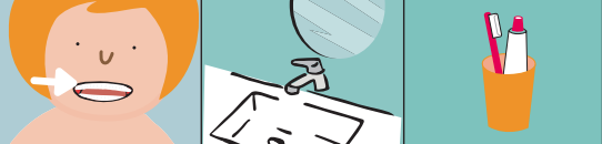 Por ejemplo: Me limpio los dientes en el lavabo con un cepillo de dientes y pasta de dientes.