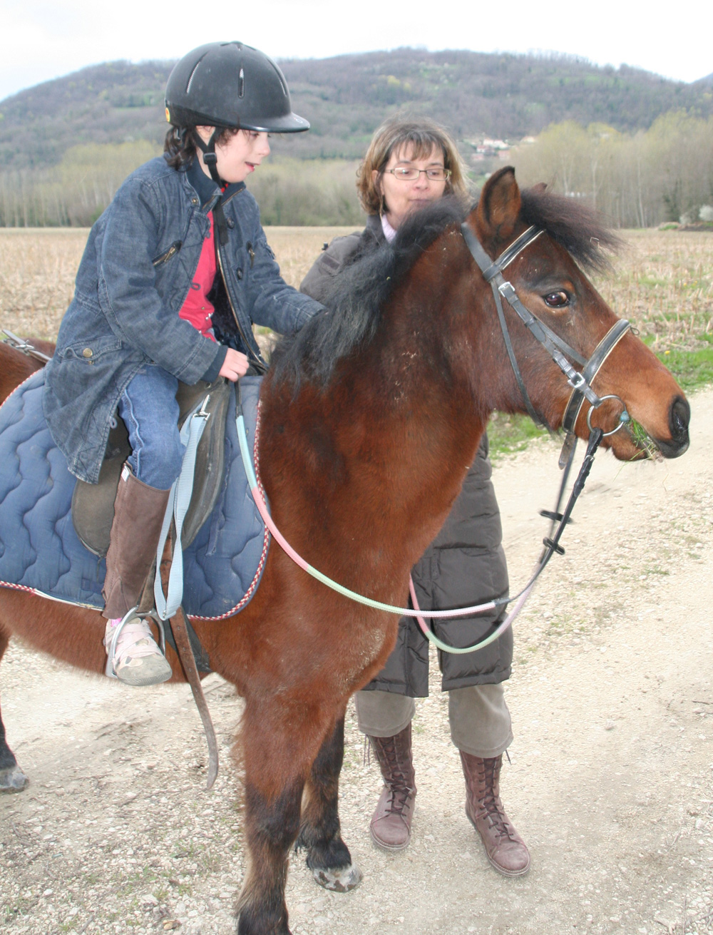 Testimonio de Céline Morisse, mamá de Jeanne (con síndrome de Rett) « Apasionada por la equitación, senté a Jeanne en un caballo desde el momento en el que supo mantenerse sentada. Tras el anuncio de la discapacidad, todas mis esperanzas de que fuera una jineta se esfumaron…Pocas semanas después del diagnóstico, el centro ecuestre en el cual monto me propuso acoger en mi casa a dos caballos para sus «jubilaciones», Pantalón y Nankin, dos caballos Merens, de 24 y 26 años. Unos días tras su llegada, puse a Jeanne sobre Pantalón para ver su reacción. De inmediato su cara se iluminó. Al principio recostada, con la cara en los crines, se enderezó para mantenerse sentada. Estaba feliz. Sus manos fueron naturalmente al cuello. Su estereotipia desapareció unos instantes. Desde aquel día, Jeanne monta con regularidad. Le gusta el contacto de sus piernas ciñendo el lomo de Pantalón, sentir el calor del cuerpo y los movimientos de los músculos del caballo. Sentirme a mí detrás de ella le da más seguridad. Durante nuestros paseos, Jeanne tiene que hacer muchos esfuerzos para mantenerse bien sentada. El balanceo de los pasos del caballo le obligan a reequilibrarse a cada zancada. Sus abdominales y sus dorsales trabjan, más aún considerando que se apoya cada vez menos en mí. Pero más allá de su función innegable de fisio, es sobre todo la relación que tiene con el animal y como disfruta, lo que me parece lo más importante. La veo más autónoma cuando está a caballo. Con los caballos, la noción « de equiplacer » me parece más apropiada que la de « equinoterapia »…