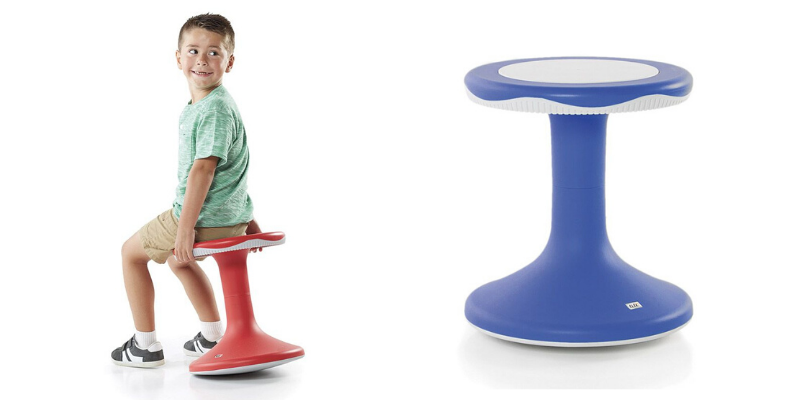 El taburete Tilo, por su parte, es un taburete con una base redondeada que permite que la persona que se sienta sobre él realice un movimiento continuo. A diferencia de las pelotas y los cojines Dynair, el taburete no rebota, sino que más bien permite realizar un movimiento de balanceo, que los niños suelen preferir.